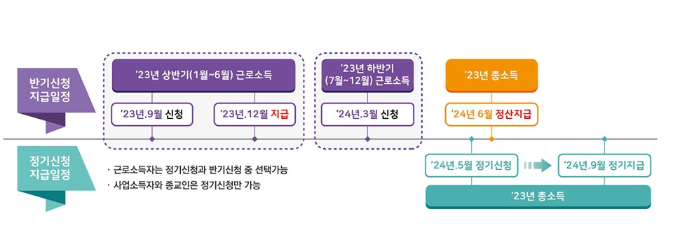 근로 자녀장려금은 정기와 반기 중 선택 신청이 가능합니다. 반기 지급은 소득 발생시점과 장려금 수급시점 간의 격차를 줄이기 위한 것으로, 상반기는 23년 9월 1일부터 15일까지 신청받아 작년 12월에 지급이 완료되었고, 금번에 하반기분 신청을 2024년 3월 1일부터 15일까지 신청받아 올해 6월 말에 지급됩니다. 정기 신청은 24년 5월 1일부터 31일까지 접수가 진행되며 9월에 장려금이 지급됩니다.
